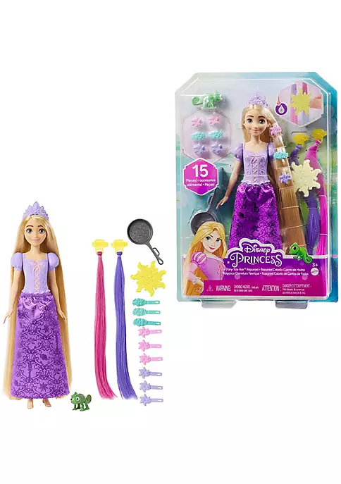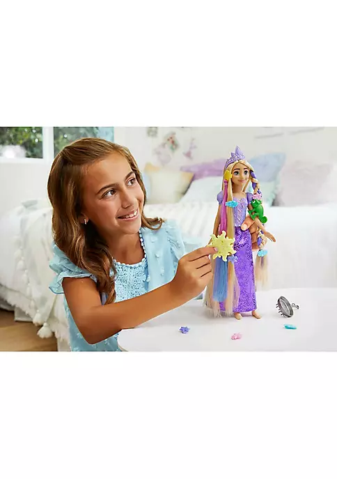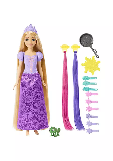 This Rapunzel doll, inspired by the vibrant and creative princess from Disney’s Tangled, features extra-long hair and so many ways to style it! Set includes 2 color-change hair extensions and lots of hair-styling accessories for all the fairy-tale looks kids can imagine! Doll cannot stand alone. Colors and decorations may vary.