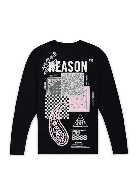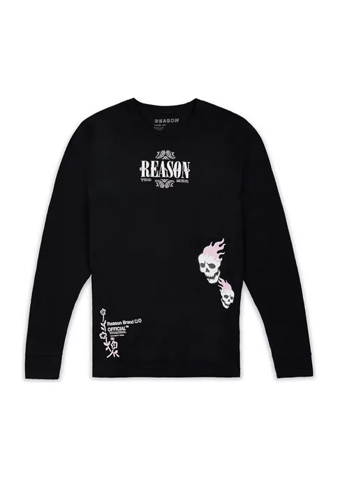 This Reason Brand logo t-shirt features the brand name emblazoned across the front, two flaming skulls along the left front side of the shirt, and a smaller logo on the bottom right.