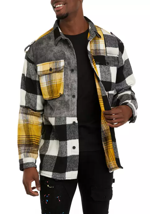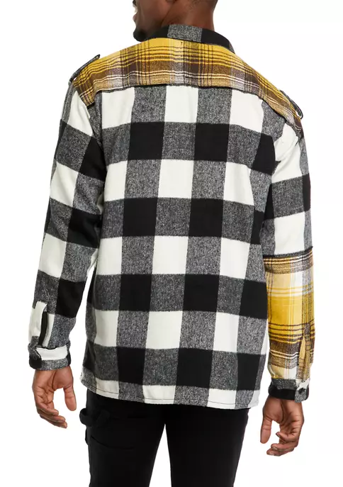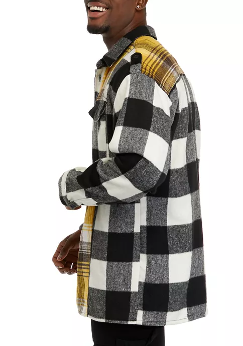 This color-blocked plaid shirt from Reason clothing features clashing plaid fabrics.