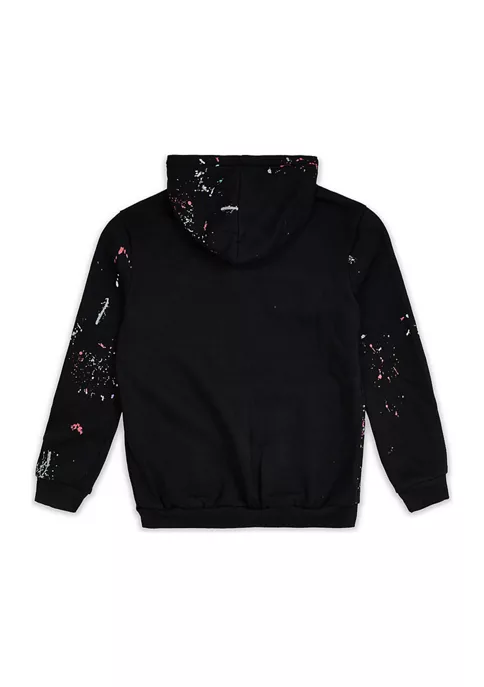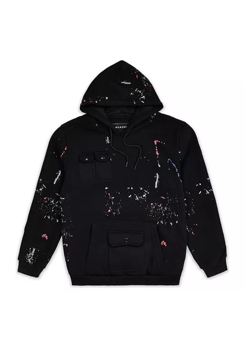 This black Reason Clothing hoodie features multi-colored paint splatter to create a carefree, casual appearance.