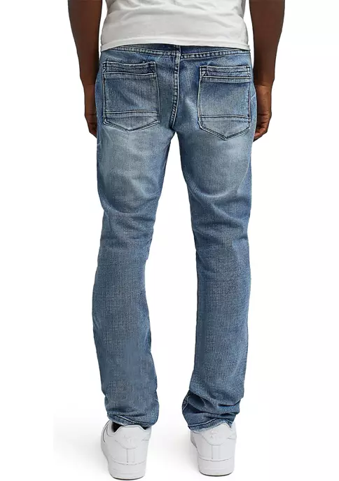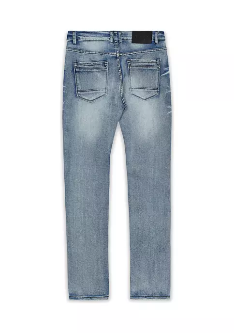 These intentionally distressed jeans from Reason Clothing have a plaid fabric layer detail.