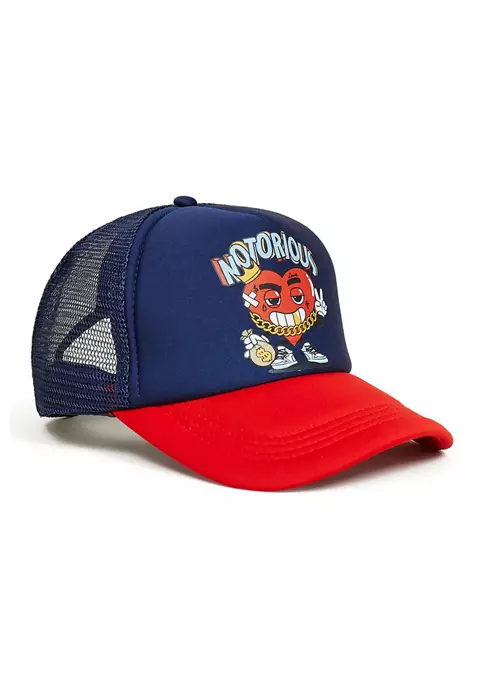 This goofy “Notorious” heart character mellows out the classic trucker hat by Reason Clothing.